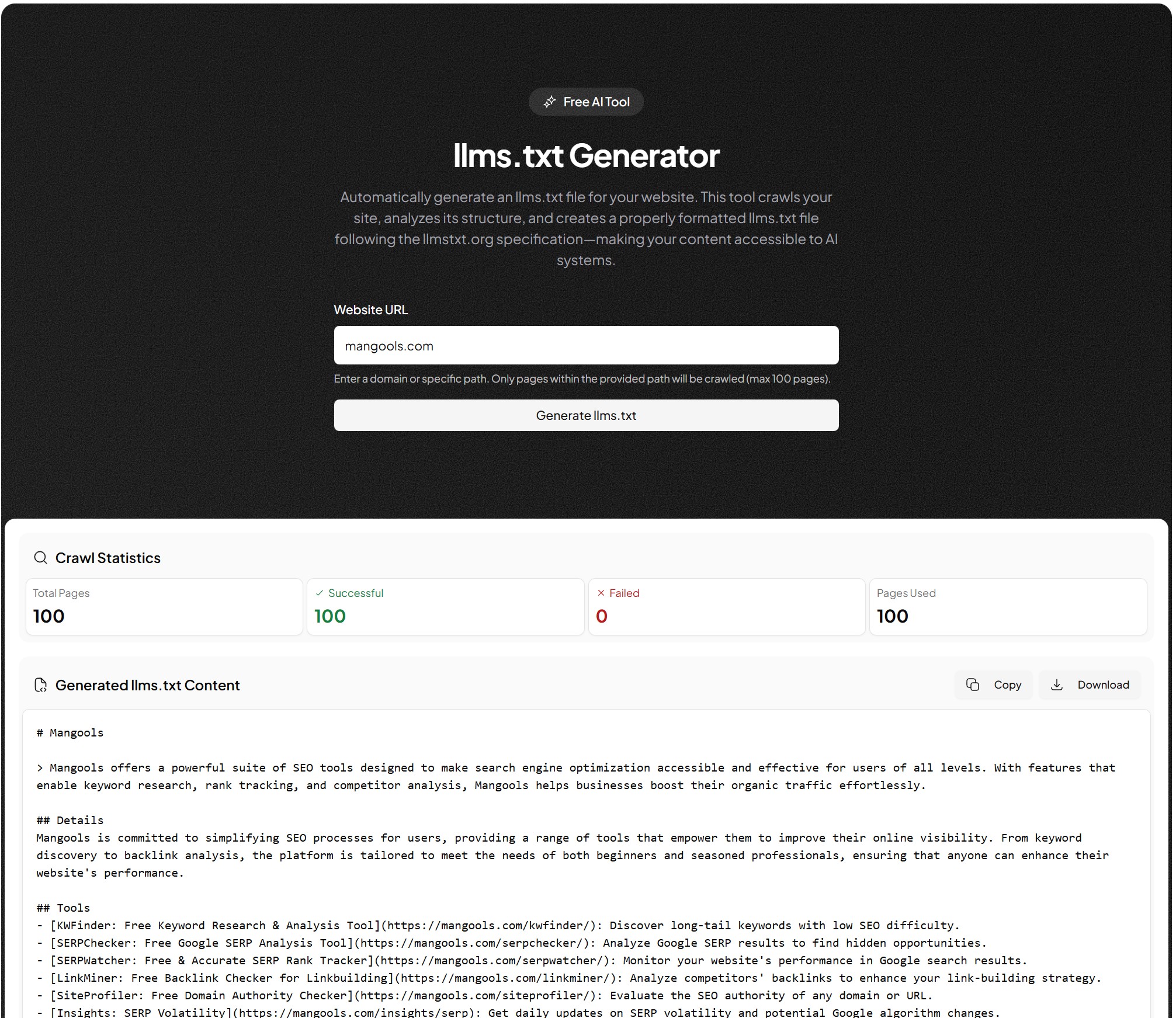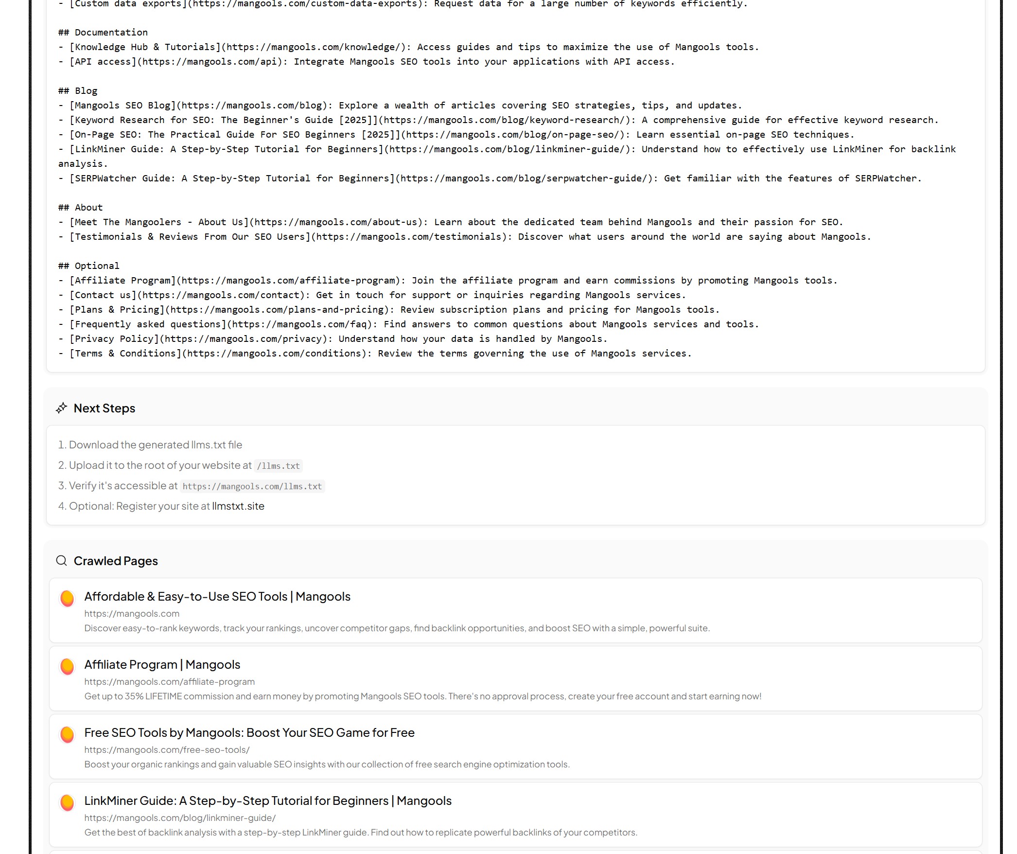 Enter your URL above and let our tool automatically crawl and generate an llms.txt file.